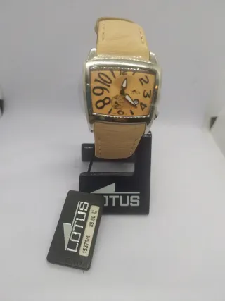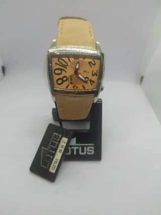Reloj de la marca Lotus con un diseño moderno y llamativo. - Esfera naranja con números grandes. - Correa de piel en tono beige. - Cierre de hebilla. - Incluye etiqueta de precio original.