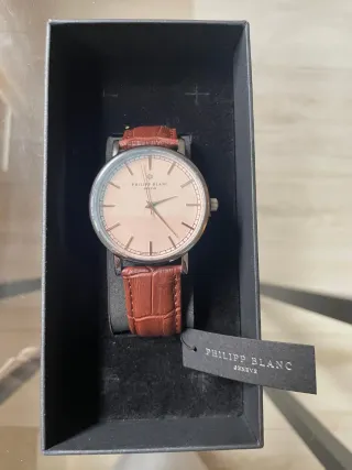 Vendo reloj Suizo nuevo PHILIPP BLANC modelo BASEL. La correa es de cuero y color marrón. Efecto piel cocodrilo. El fondo es color Beige. Logo de la marca en la Corona. Nuevo sin estrenar y Unisex. Lo vendo porque fue un regalo y no lo usaré. Precio nuevo 189€ Lo vendo por 99€