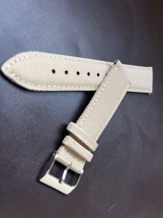 Correa de repuesto para reloj, fabricada en tela resistente con un acabado en color beige. Incluye una hebilla plateada para un ajuste seguro. Medida ancho de asas 22mm - Material de tela duradero. - Diseño clásico con pespuntes. - Hebilla de metal plateado. Sin uso, nueva