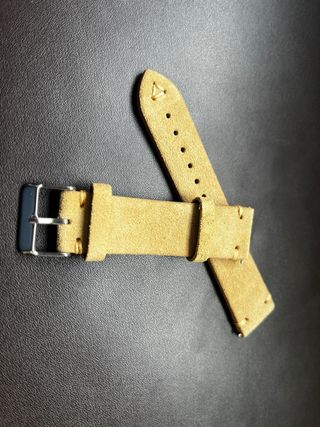 Correa de reloj de ante en color beige con detalles de costura. Medida ancho de asas 22mm - Hebilla de metal plateado. - Múltiples agujeros para ajuste. Nueva, sin estrenar