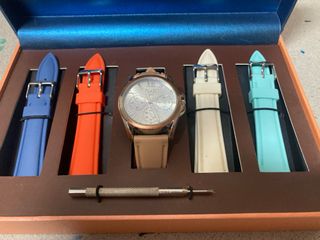 Set de reloj G&B Time con varias correas para personalizar tu estilo. Incluye un práctico accesorio para cambiar las correas. - Correa beige puesta en el reloj. - Correas adicionales de color azul, naranja, blanco y turquesa. - Hebillas plateadas.