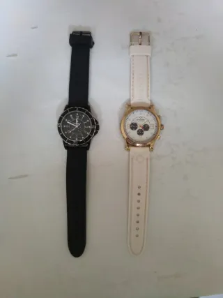 Dos relojes de pulsera con correas en diferentes tonos. - Un reloj con correa blanca y detalles plateados en la esfera. - Otro reloj con correa beige y detalles rojos en la esfera. El sanyo hay que cambiarle la correa Pila recién colocadas