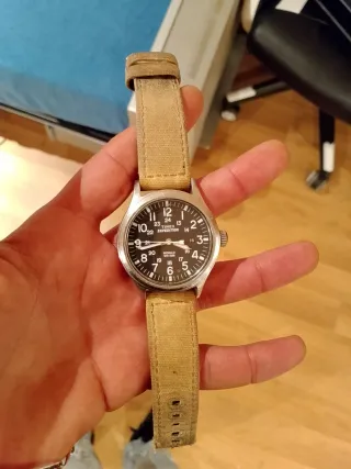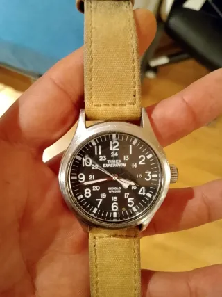 Reloj Timex Expedition con correa de tela. - Esfera negra con números claros. - Correa de tela en color beige.