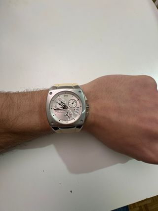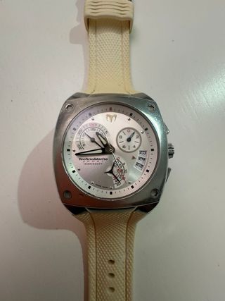 Elegante reloj TechnoMarine con detalles en beige y plateado. - Diseño moderno y sofisticado. - Correa con acabado texturizado. - aguja grande del segundero de afuera averiado el reloj funciona perfectamente solo que esa aguja hay veces que se para pero no afecta a la hora ni al funcionamiento del reloj