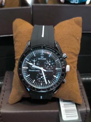 Elegante reloj cronógrafo con detalles en beige y marrón. Su diseño combina una caja de acero con una correa de caucho. - Esfera con índices y agujas de fácil lectura. - Bisel con escala taquimétrica. - Subesferas para funciones de cronógrafo. Entrega inmediata a domicilio y pagas al recibir