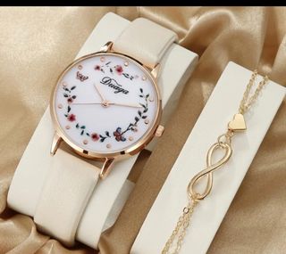 Reloj con correa beige clarito y detalles florales en la esfera. Viene sin pila. Pulsera con símbolo infinito. Completamente nuevos sin salir del envoltorio.