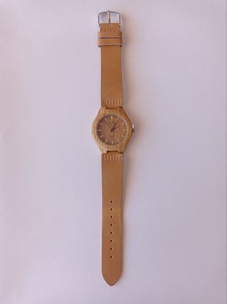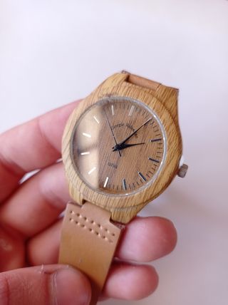 Reloj de madera con correa de cuero blando. Es de color marrón claro y beige. Me costó 14 euros en Países Bajos. - Correa de cuero. - Caja de madera. - Diseño sencillo y elegante. - Pestaña de plástico sin quitar en el regulador de las horas.