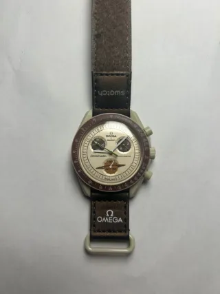 Reloj de la exclusiva colección Bioceramic MoonSwatch, colaboración entre Omega y Swatch. Modelo Mission to Saturn, inspirado en el icónico Speedmaster y en el planeta Saturno. ✨ Características: • Caja de biocerámica en tono beige • Bisel marrón con escala taquimétrica • Cronógrafo funcional • Correa de velcro marrón con branding Omega x Swatch • Diseño ligero y cómodo • Movimiento de cuarzo suizo 📦 Estado: Excelente / como nuevo (pequeña marca en el cristal ) 📦 Incluye: Caja original y documentación (ver fotos)