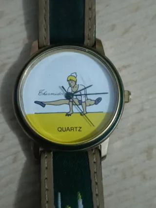 Reloj de pulsera con un diseño único de bailarina. - Esfera con ilustración de bailarina. - Correa de tela con detalles verdes y beige. - Mecanismo de cuarzo. - Pila recién puesta funciona perfectamente. - Las fotos forman parte de la descripción. Si quieres ver más mira mi perfil :)