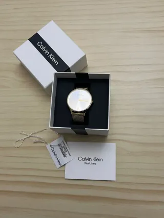 Reloj de Calvin Klein que no se ha sacado de su caja. Perfecto para regalar. Muy elegante. Lo vendo a menos del 50% de su precio. Cuerda: Cuarzo Color de la esfera: Plata Material de la caja: Acero Diámetro de la caja: 28 mm Resistencia al agua: 3 ATM Cristal: Cristal mineral Material de la correa: Acero Color de la correa: Oro