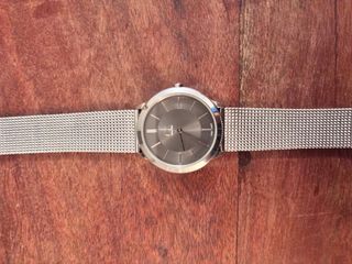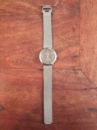 Elegante reloj de pulsera con diseño minimalista. Un lado de la correa está suelta pero se arregla fácilmente. Acepto ofertas y hago precio a lotes. - Esfera gris con textura. - Correa de malla metálica. - Caja de acero inoxidable.