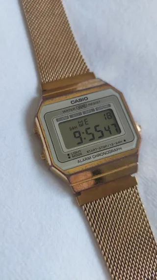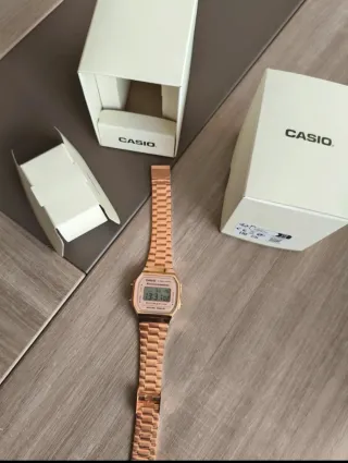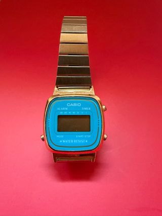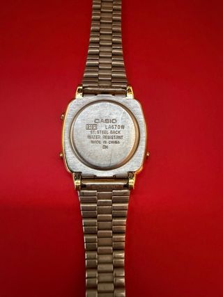 Reloj Casio modelo digital con acabado dorado y resistencia al agua. Tiene ralladas del propio uso, ver en la segunda y tercer fotos. - Correa de metal. - Función de alarma y cronómetro. - Pantalla LCD.