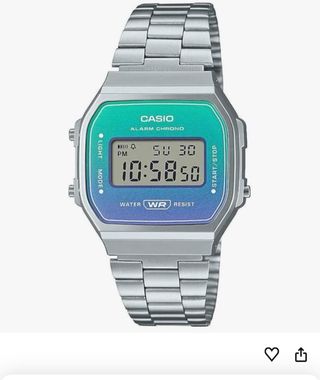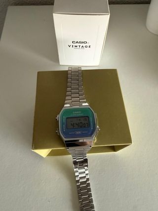 Reloj Casio de estilo vintage con un diseño degradado en tonos azules y verdes. - Correa de metal. - Pantalla digital. - Resistente al agua.