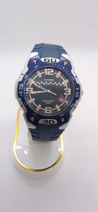 Reloj Casio con correa de goma azul. - Esfera negra con detalles en naranja. - Resistencia al agua de 50 metros. Con caja y papeles.