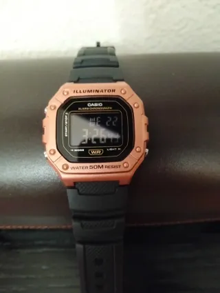 Reloj Casio con pantalla digital y correa negra, modelo Man-W-218HM. - Función iluminador. Caja de resina. Cronómetro, alarma, calendario automático,luz lend - Resistente al agua 50M. - Diseño con detalles dorados. Sin usó