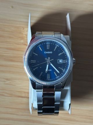 Elegante reloj Casio con esfera azul y detalles plateados. - Diseño clásico y versátil. - Correa de acero inoxidable. - Resistente al agua 50M.