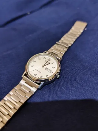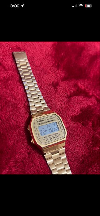 Reloj Casio con acabado dorado y diseño clásico. - Correa de metal. - Pantalla digital. - Resistente al agua. - Color de las correas un poco desgastado.