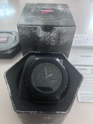 Reloj Casio G-Shock en color negro, con su caja original y manuales. - Analógico- Digital - Modelo: GA-2100 - Resistencia al agua 20 BAR - Incluye caja metálica hexagonal - Manual de usuario - diámetro de la caja 42 milímetros - Ancho de banda 25 milímetros - Grosor de la caja 11,8 milímetros - longitud de la correa 21 centímetros - peso 30 gramos - Correa de caucho - Calendario Fecha y mes - características especiales: cronógrafo, hora mundial, temporizador, iluminador, alarma. -Talla única En perfecto estado, puesto un par de veces. ( lo vendo por que no lo uso)