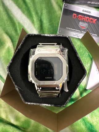 Reloj Casio G-Shock con caja y correa de metal plateado. Incluye la caja original y la tarjeta de garantía internacional. - Modelo: GM-5600YM-8ER - Módulo: 3525 - Resistencia al agua: 20 BAR - Material: Acero inoxidable