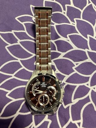 Reloj Casio Edifice con resistencia al agua de 100 metros. - Esfera con detalles en tonos marrones y plateados. - Correa de metal. - Diseño deportivo y elegante.