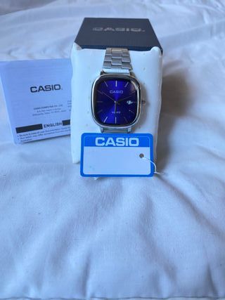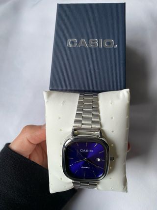 Elegante reloj Casio con una esfera azul vibrante y detalles plateados. - Diseño moderno y sofisticado. - Correa de metal. - Caja con logo Casio.