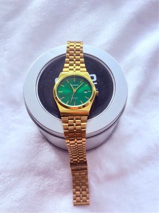 Elegante reloj Casio con una combinación de colores dorados y verde esmeralda en la esfera. Su diseño clásico lo hace un accesorio versátil. - Correa de metal dorada. - Esfera redonda de color verde. - Cierre de seguridad.