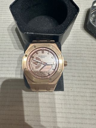 Reloj Casio GA-2100 con un acabado en oro rosado. - Diseño octogonal. - Correa metálica. - Esfera con detalles en relieve.