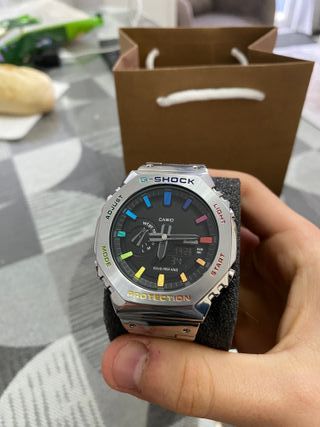 Reloj Casio G-Shock con un diseño llamativo y moderno. - Con caja y papeles - Esfera con detalles multicolor. - Correa de metal plateada. - Modelo: GM-2100 - Estado: Como nuevo