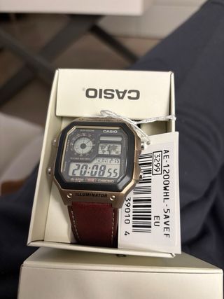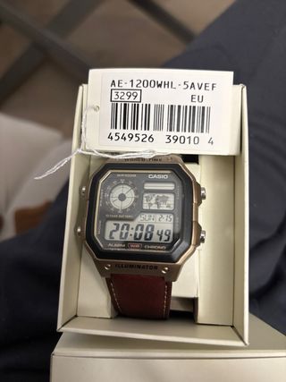 Reloj Casio con correa de cuero marrón y detalles dorados. - Modelo AE-1200WHL-5AVEF. - Correa de cuero marrón. - Bisel y detalles en tono dorado.