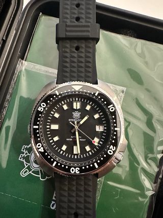 Reloj Steeldive modelo 1970 Willard, inspirado en diseños clásicos de buceo. Incluye su caja protectora y paño de limpieza. - Esfera negra con marcadores luminosos. - Bisel giratorio ceramico. - Cristal de zafiro. - Correa de caucho negra. - Caja de acero inoxidable. - Caja y documentación. - No se ha usado.