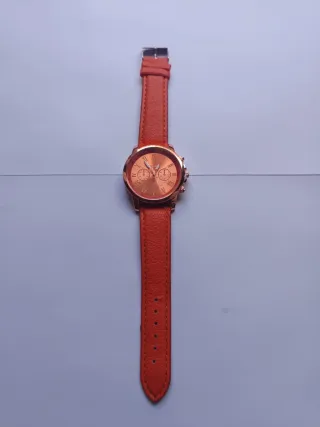 Elegante reloj con esfera dorada y correa de cuero naranja. - Diseño con múltiples esferas. - Correa de cuero con hebilla metálica.