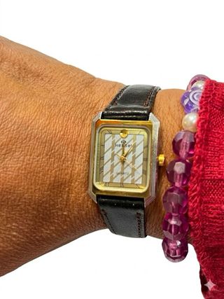 Reloj clásico de la marca Potencial, modelo Quartz 66653-886. Caja posiblemente de acero chapado en oro, aunque el chapado está desgastado por el uso. La parte trasera indica "Stainless Steel Back". La esfera está en buen estado, sin rayaduras aparentes. Tiene una correa de cuero marrón, bastante usada pero funcional. No tiene pila actualmente, pero funciona correctamente. Ideal para coleccionistas o amantes de los relojes vintage.