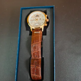 Elegante reloj con correa de cuero y detalles dorados. - Diseño clásico y sofisticado. - Correa con acabado texturizado. - Esfera con múltiples indicadores.