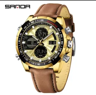 Elegante reloj Sanda con correa de cuero marrón y detalles dorados. - Diseño moderno y llamativo. - Correa de cuero. - Caja y bisel en tono dorado.