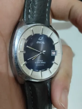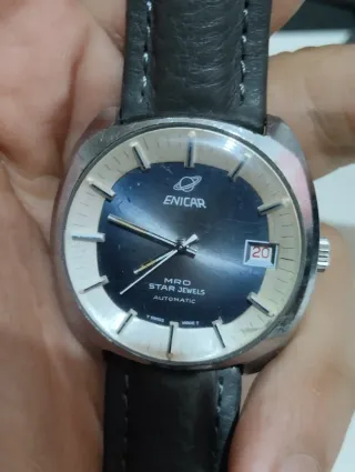 Reloj de pulsera Enicar con esfera azul y detalles plateados. - Modelo Star Jewels. - Movimiento automático. - Correa de cuero negra. - material de caja cromado