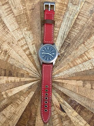 Reloj Hamilton Khaki automático con caja de 42 mm. Está completamente nuevo, sin estrenar. Con toda su documentación y garantía de 2 años. - Correa de cuero negra con costuras blancas. - Cierre de hebilla plateado.