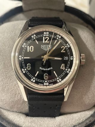 Este es un reloj reeditado que Tag Heuer lanzó en la década de los 2000 para conmemorar el Heuer Carrera original de 1964. Precioso estilo vintage. 35 mm. Muy buen estado. Con caja, sin documentos. El cuero de la caja interior está un poco dañado, algo típico en las cajas Tag Heuer de esa época. La correa de cuero no es de Tag Heuer, pero le va perfecta esta nueva y es muy similar a la original. Wallapop no me deja poner el precio , se vende en 1595€