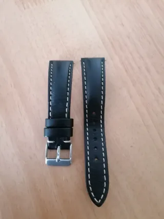 Correa de reloj de cuero con un diseño clásico y elegante. - Hebilla de metal plateado. - Costuras blancas a contraste. - Material de cuero.