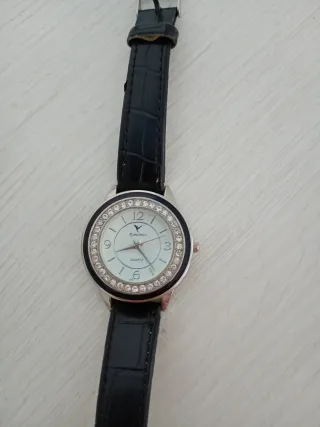 Elegante reloj con correa de cuero y detalles brillantes. - Bisel adornado con pedrería. - Correa de cuero con textura.