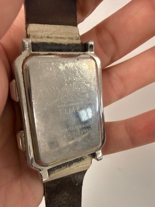 Reloj de pulsera con correa de cuero negra y detalles plateados.el reloj funciona tiene desgastes como se ve en las fotos hace parte de las descripciones no aceptó devoluciones. - Esfera blanca con números y marcadores. - Correa de cuero. - Caja de metal plateado . Tiene el cristal rallado hay que cambiarlo.