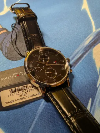Elegante reloj Tommy Hilfiger con correa de cuero negra y detalles plateados. - Esfera negra con números romanos. - Correa de cuero negra con acabado brillante. - Bisel plateado. - Cierre de hebilla.