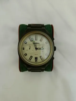 Vendo reloj Diesel modelo Diesel DZ4342 en color dorado, un reloj muy llamativo y con mucha presencia en muñeca gracias a su diseño grande estilo oversize típico de Diesel. Cuenta con esfera negra con detalles dorados y subesferas de cronógrafo, un diseño moderno que combina muy bien tanto con outfits casual como con estilo más elegante o urbano. El reloj se encuentra en perfecto estado estético, muy bien cuidado. ⚠️ Importante: • Actualmente no tiene pila • No incluye caja ni papeles Solo habría que ponerle una pila nueva para que funcione. Es un reloj muy popular de Diesel, con caja grande de acero inoxidable y correa metáli