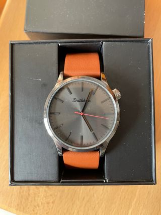 Elegante reloj Bratleboro con correa de cuero. - Esfera gris con detalles plateados. - Correa de cuero marrón. - Diseño moderno y minimalista.