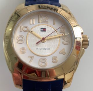 Tommy Hilfiger, reloj dorado, esfera gris, correa azul . La caja mide 35mm. Reloj estanco 3 ATM. Perfecto estado.