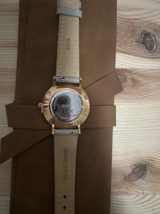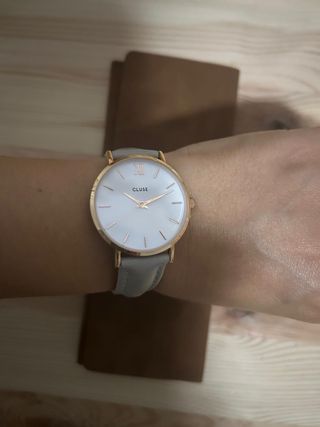 Elegante reloj de la marca Cluse con un diseño moderno y sofisticado. - Esfera redonda con detalles brillantes en el bisel. - Correa de material suave en tono gris. - Acabado plateado en la caja del reloj.