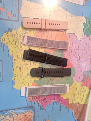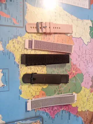 Lote de correas para relojes. - Correa de silicona rosa. - Correa de tela gris. - Correa de tela negra. - Correa de silicona gris oscuro.