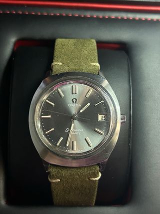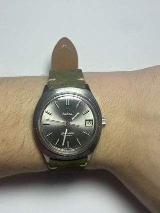 Necesita revisión Magnífico reloj Omega Seamaster Quartz, un modelo vintage con un diseño sencillo у elegante. Caja de acero con una hermosa pátina, esfera gris con efecto rayos de sol, índices aplicados y ventana de fecha a las 3. Firma Omega e inscripción Seamaster Quartz en la esfera, "Swiss Made" a las 6. Movimiento de cuarzo suizo, preciso y fiable. Cristal con pequeños arañazos propios de su antigüedad. Reloj con correa de piel tipo ante verde en buen estado (sin firmar). Diámetro ideal para un look vintage chic, ideal para uso diario o ocasiones más formales. Omega Seamaster Quartz Date, esfera gris, ref. 196.0072 Movimiento