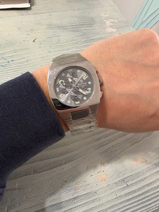 *sin caja * Pila recién cambiada (2 de marzo) en El Corte Inglés con su justificante. Reloj con una caja redonda de acero inoxidable de 43 mm de diámetro y un grosor de 9,3 mm, e incorpora una esfera gris con efecto de rayo de sol bajo su cristal mineral, además de una correa de malla plateada del mismo material con 22 mm de anchura y hebilla plegable para que te lo pongas fácilmente. También este modelo de visualización analógica y con cronógrafo para medir intervalos de tiempo funciona de manera precisa mediante un movimiento de cuarzo, y ofrece una resistencia al agua de 3 ATM.