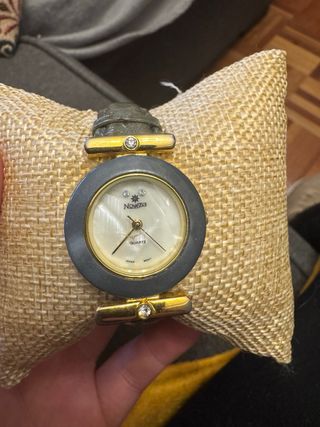 Elegante reloj de pulsera con un diseño clásico. - Correa de tela gris. - Caja de metal con acabado dorado. Es nuevo sin estrenar si te fijas