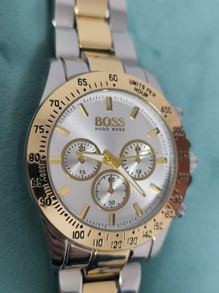 Totalmente nuevo y precintado. Solo envío. Se puede ver la review en nuestro canal de Youtube y Tik Tok @relojesolimpo Elegante reloj Hugo Boss con detalles en dorado y esfera azul. - Diseño de cronógrafo. - Bisel con escala taquimétrica. - Correa de eslabones combinada